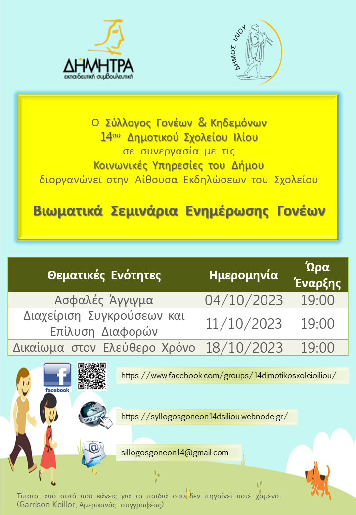 Ο Σύλλογος Γονέων & Κηδεμόνων 14ου Δημοτικού Σχολείου Ιλίου σε συνεργασία με τις Κοινωνικές Υπηρεσίες του Δήμου διοργανώνει στην Αίθουσα Εκδηλώσεων του Σχολείου Βιωματικά Σεμινάρια Ενημέρωσης Γονέων.